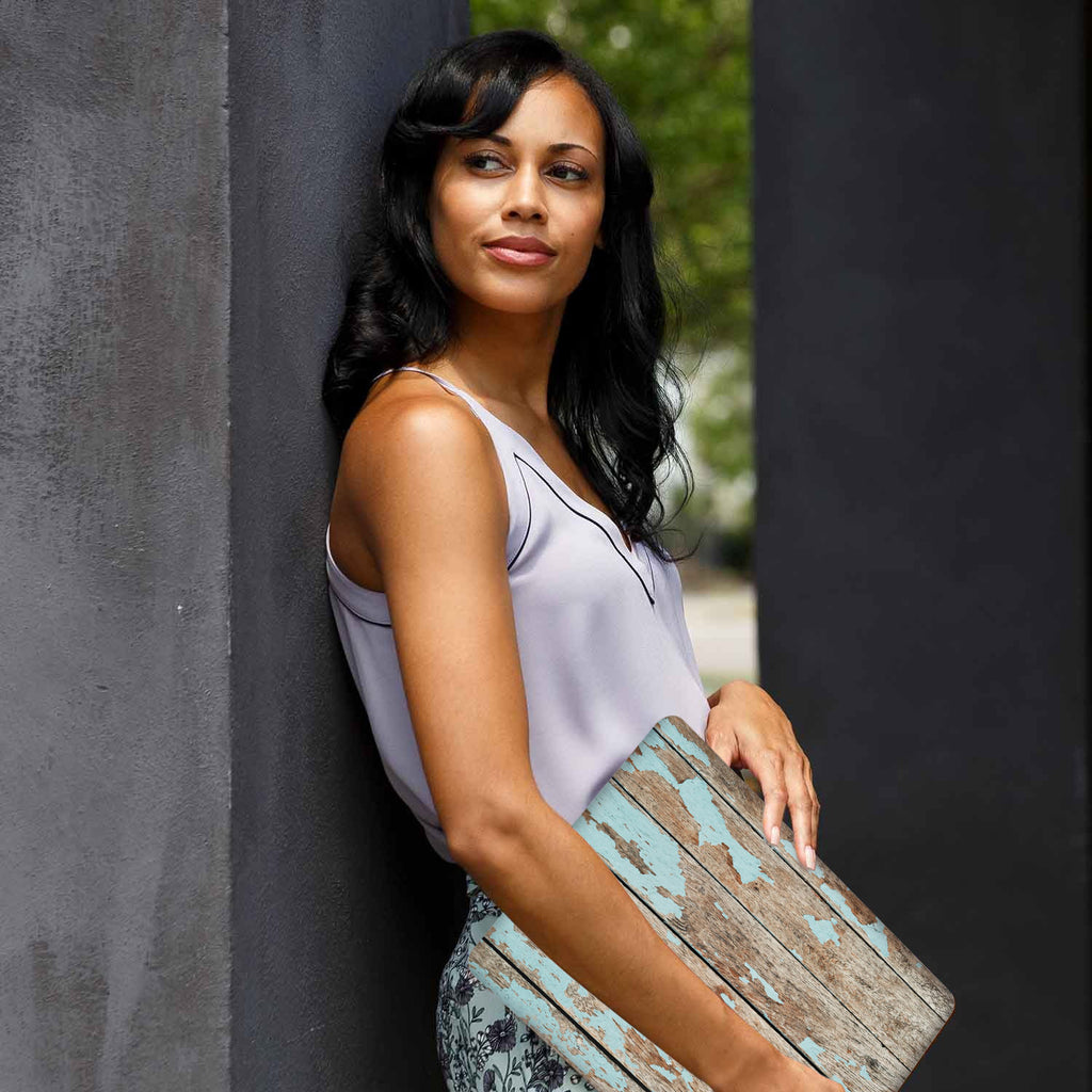 A yong girl holding personalized microsoft surface laptop case with Wood design